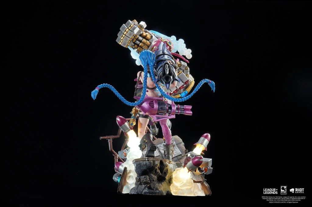 Jinx est en action avec son lance-roquettes Fishbones. Son pistolet à impulsion Zapper et son minigun Pow-Pow sont à ses côtés et prêts à être utilisés au combat. Vi est représentée en pleine action avec ses gantelets Hextech, prête à transpercer tout ce qui se trouve sur son chemin, même sa sœur.